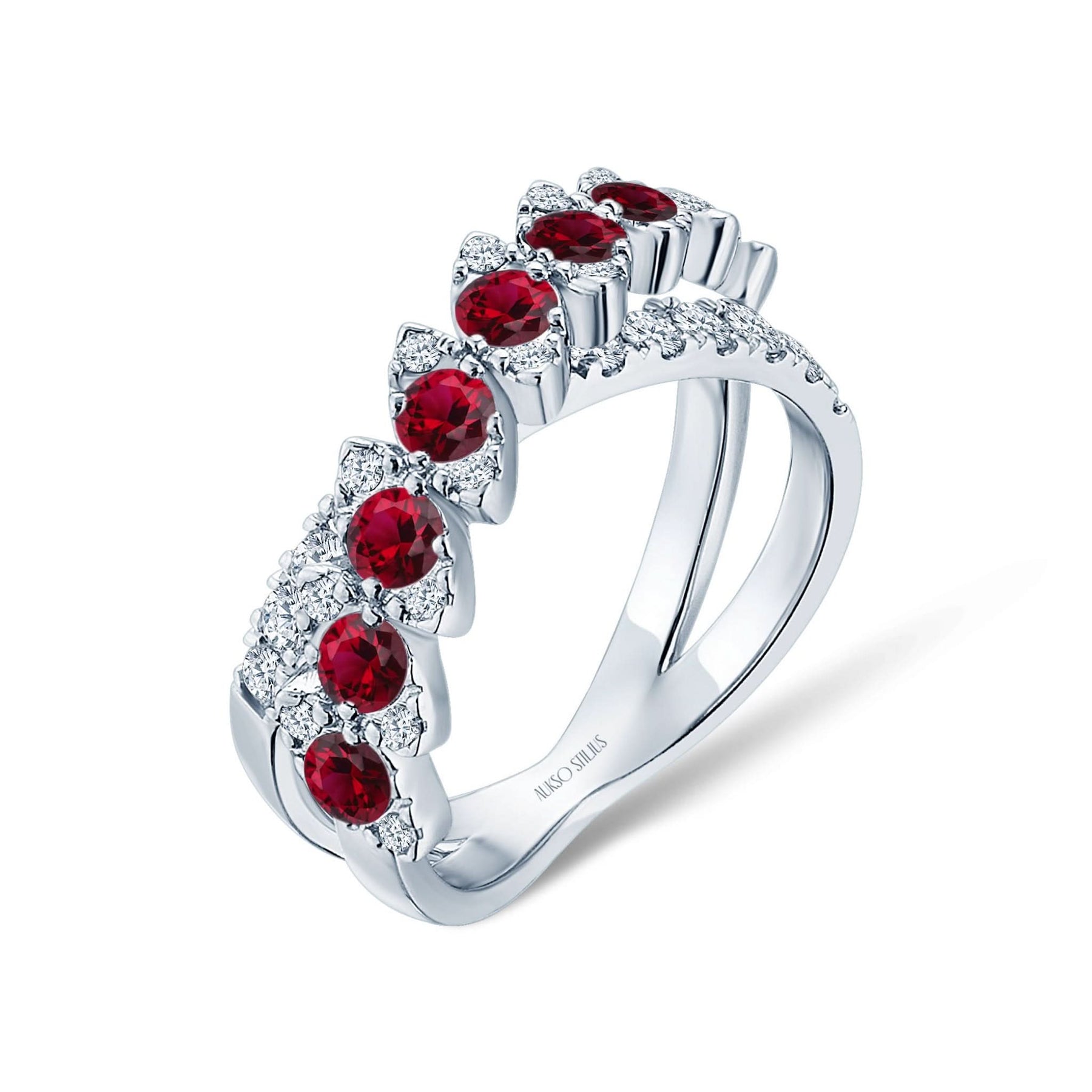 Prabangus auksinis žiedas su natūraliais, baltais deimantais ir sodriais rubinais iš kolekcijos „Exclusive“.