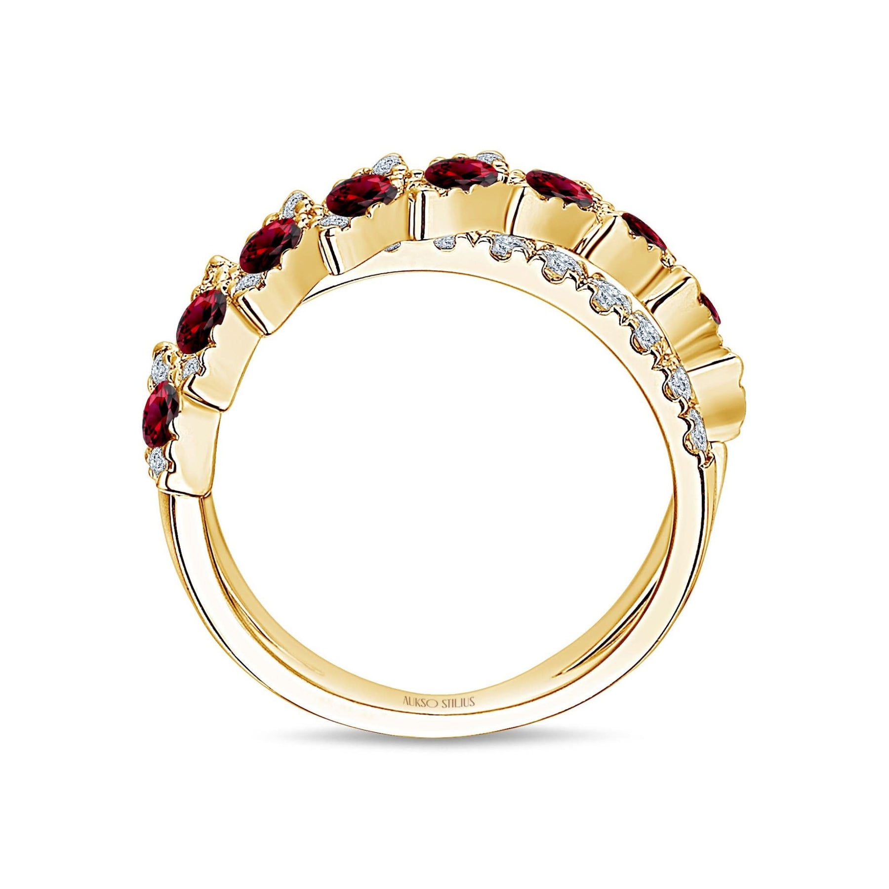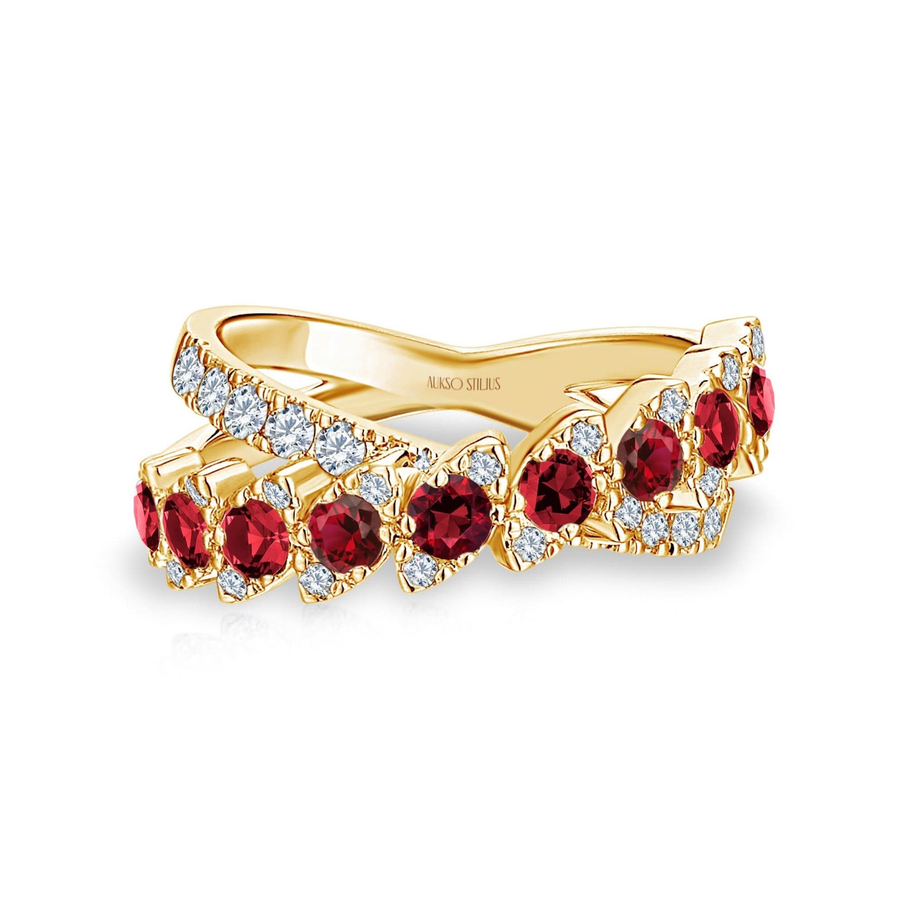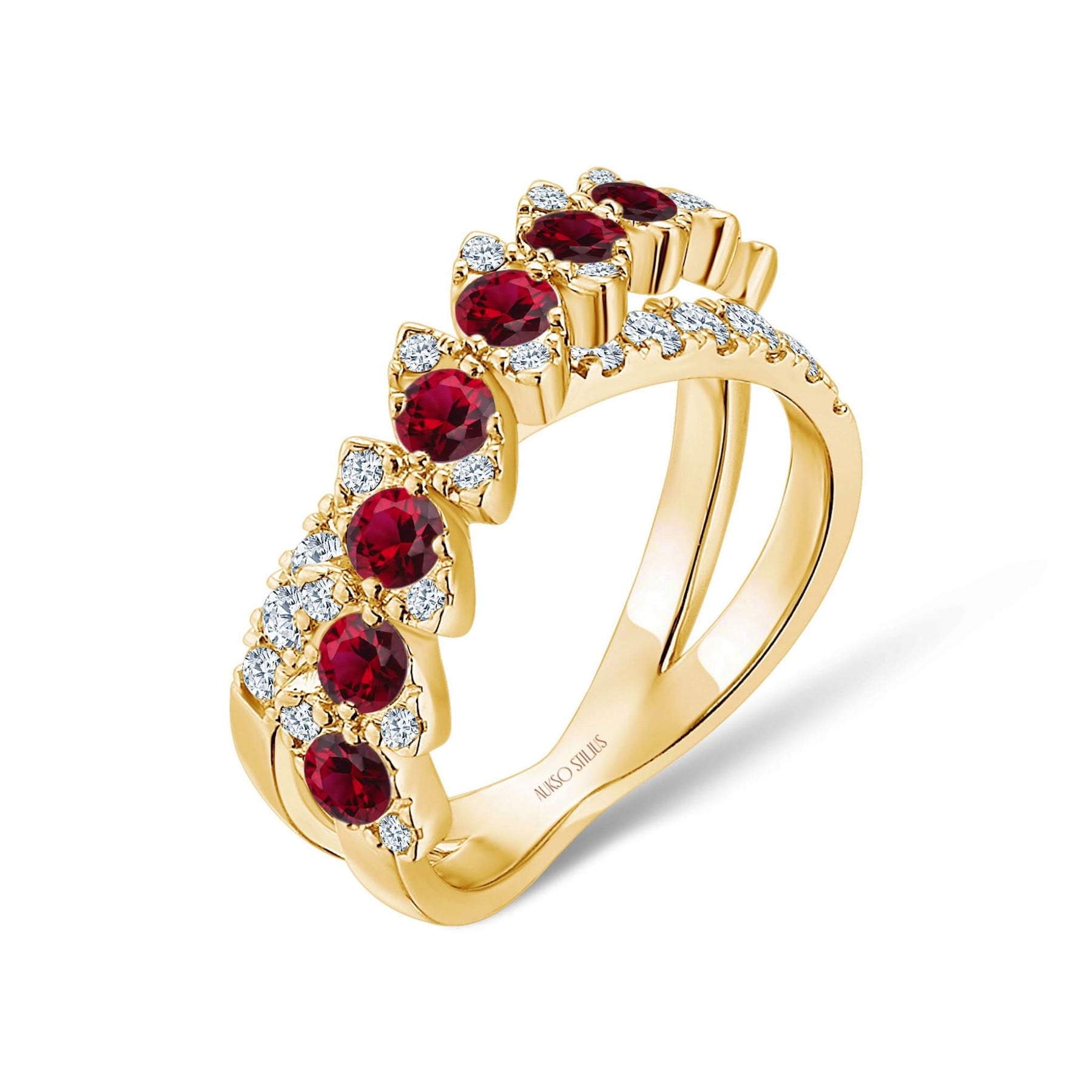 Prabangus auksinis žiedas su natūraliais, baltais deimantais ir sodriais rubinais iš kolekcijos „Exclusive“.