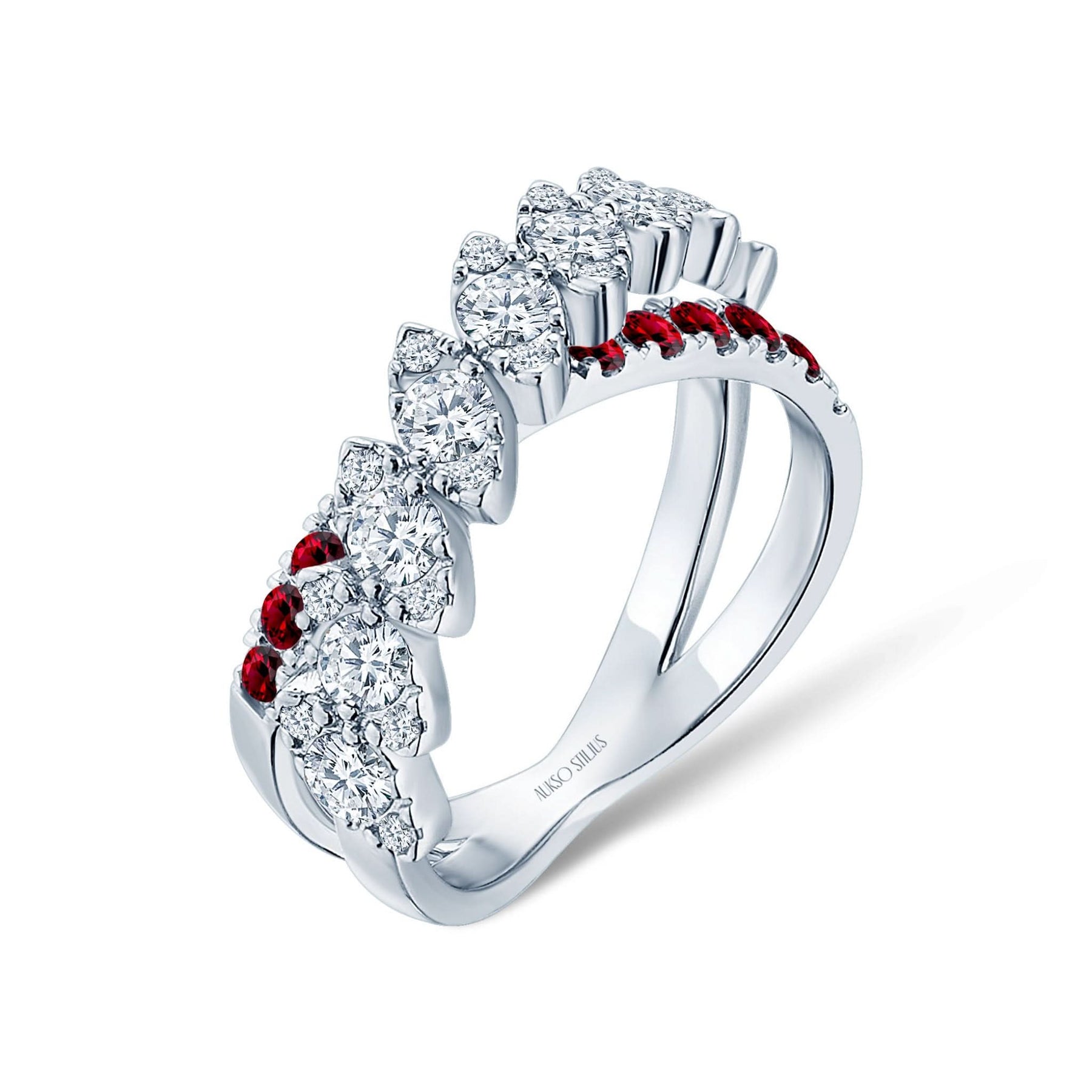 Prabangus auksinis žiedas su natūraliais, baltais deimantais ir sodriais rubinais iš kolekcijos „Exclusive“.