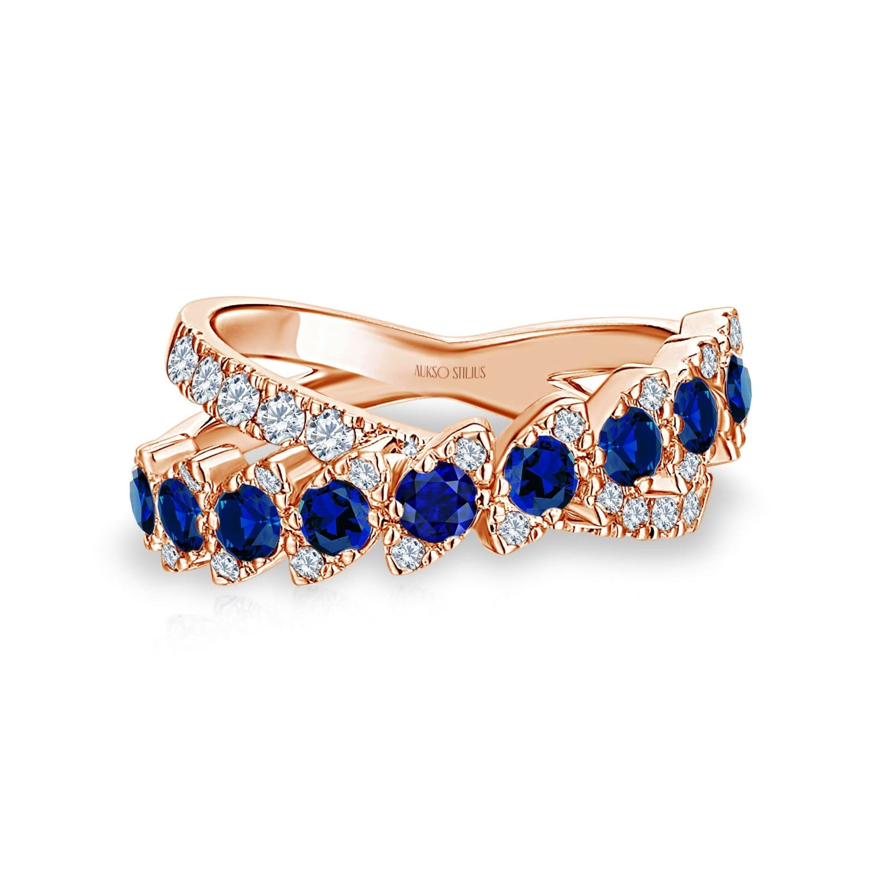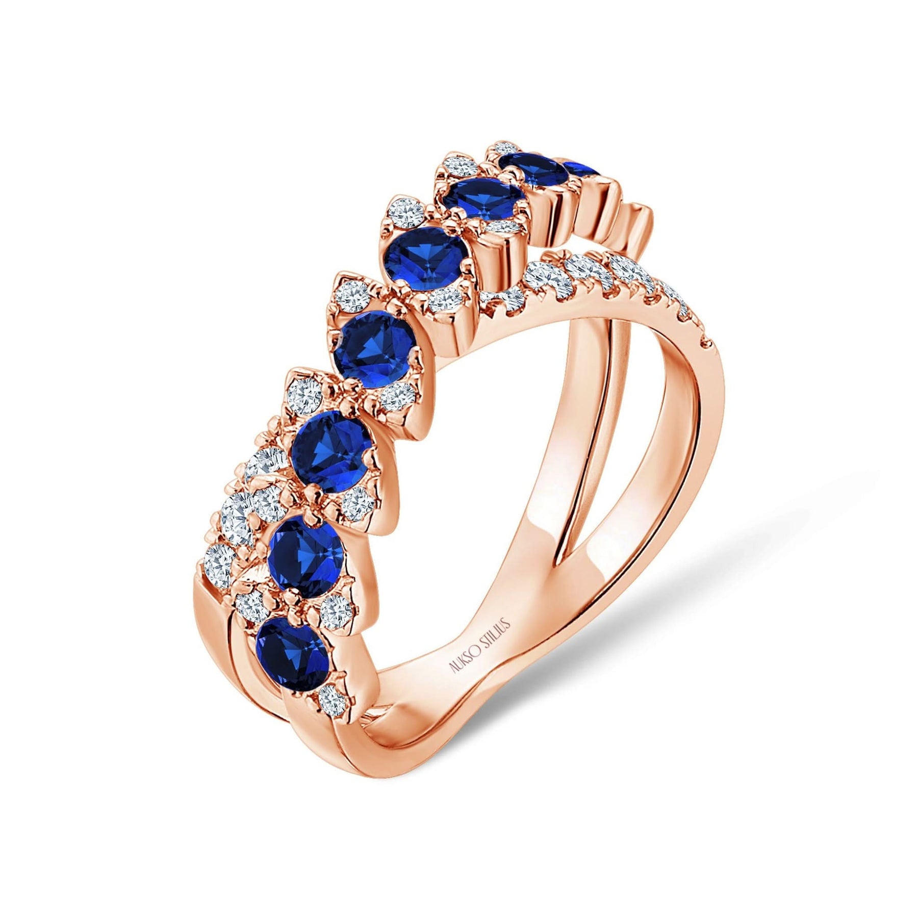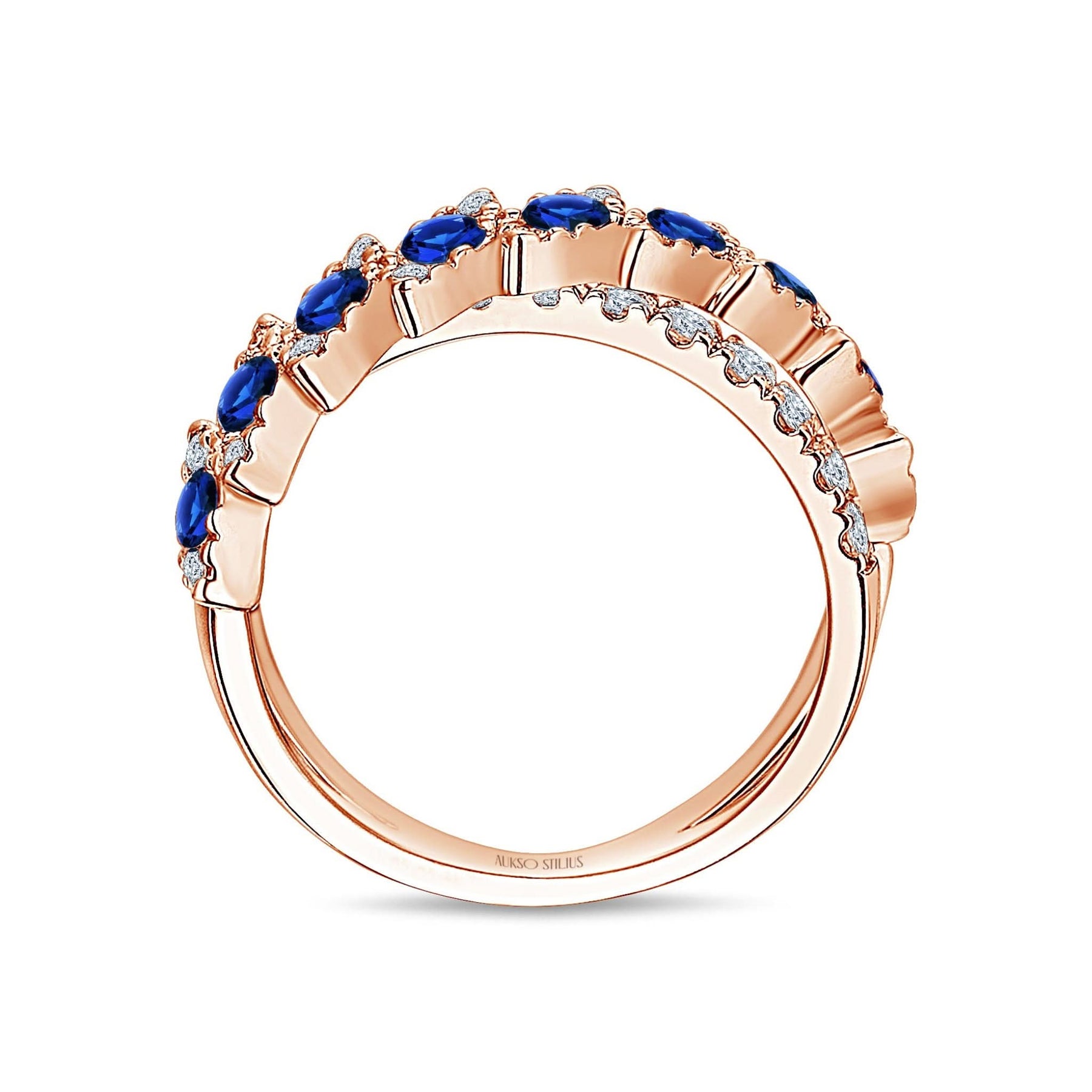 Prabangus auksinis žiedas su natūraliais, baltais deimantais ir sodriais safyrais iš kolekcijos „Exclusive“.