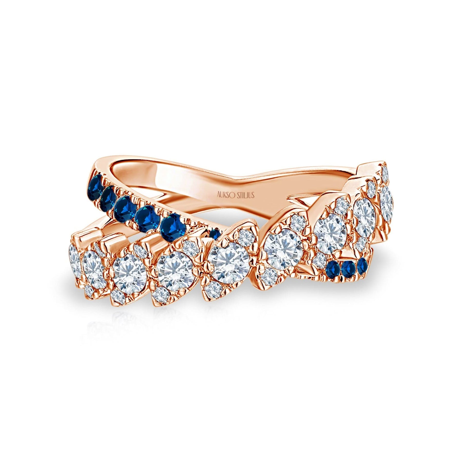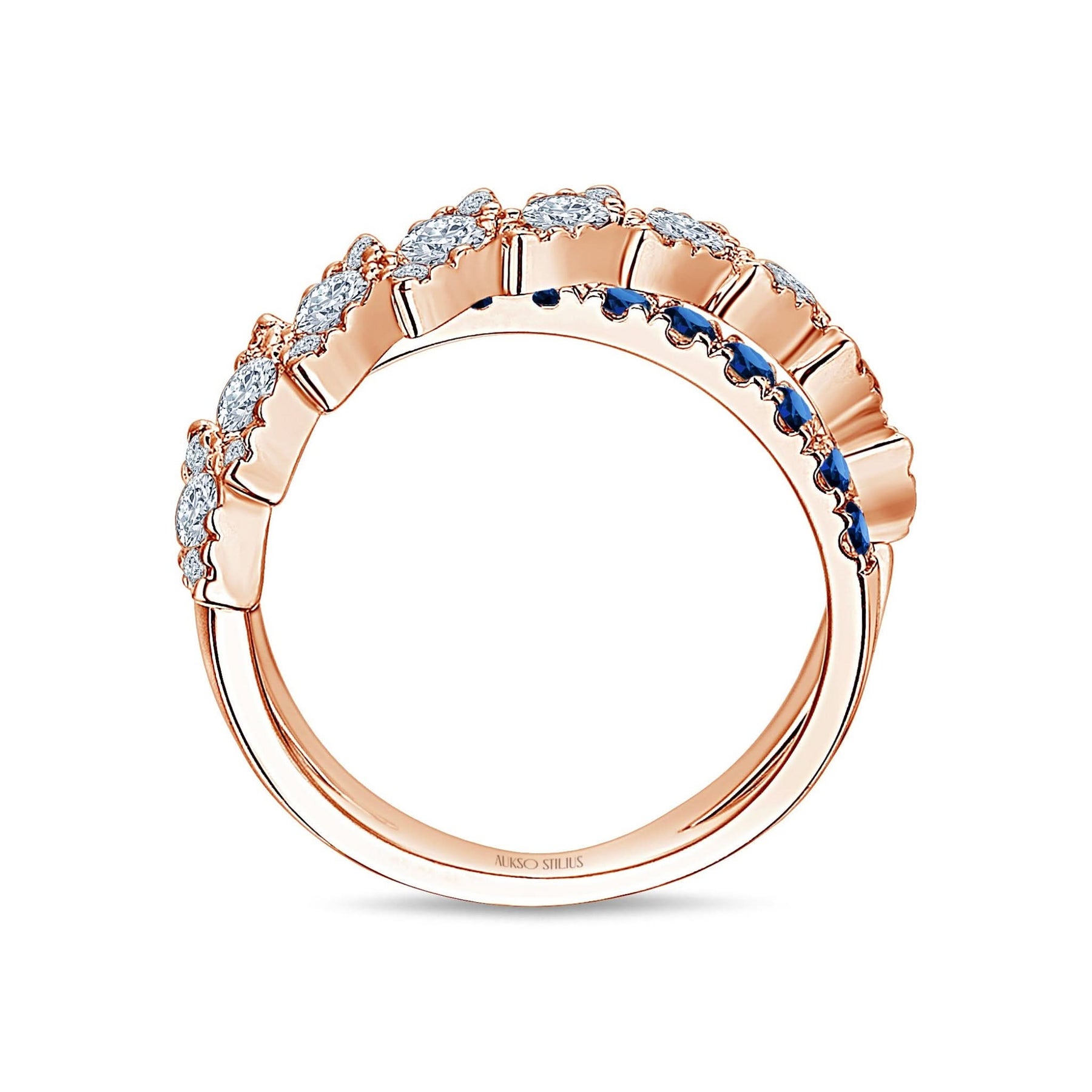 Prabangus auksinis žiedas su natūraliais, baltais deimantais ir sodriais safyrais iš kolekcijos „Exclusive“.