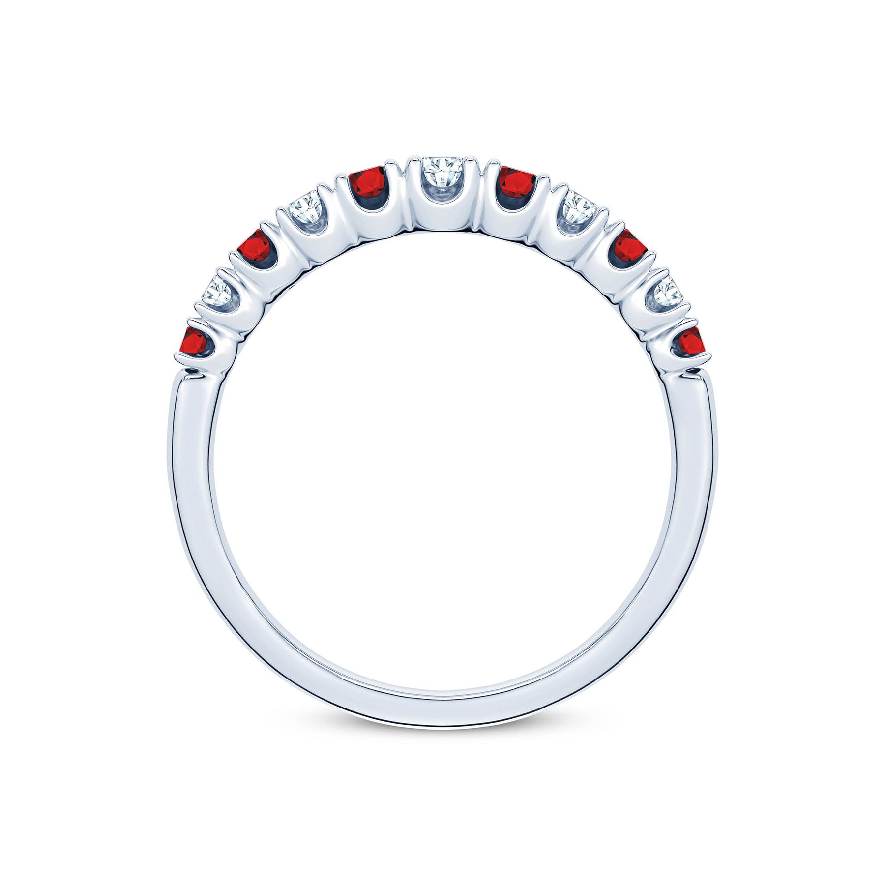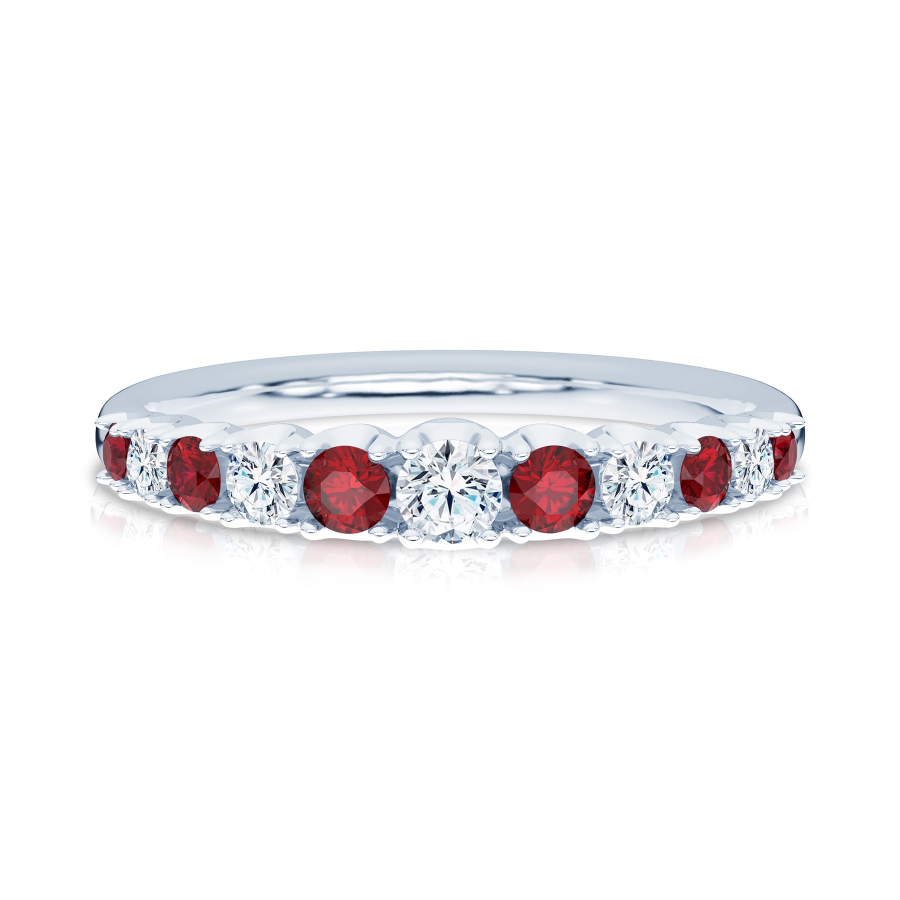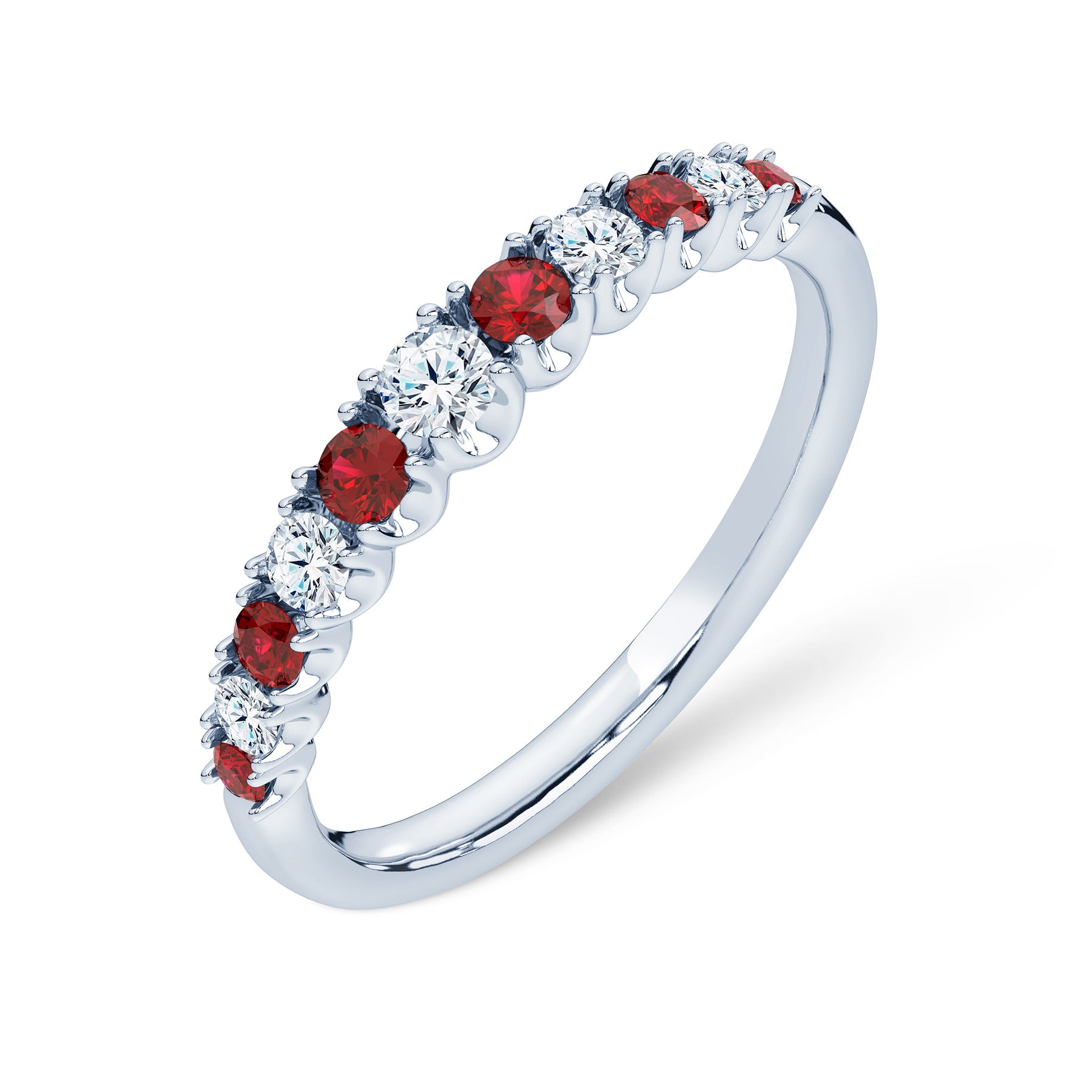 Auksinis žiedas su deimantais ir rubinais iš romantiškos ir subtilios kolekcijos „Forever“. Deimantų spindesys ir rubinų sodrumas, susiliejantis į prabangų derinį.